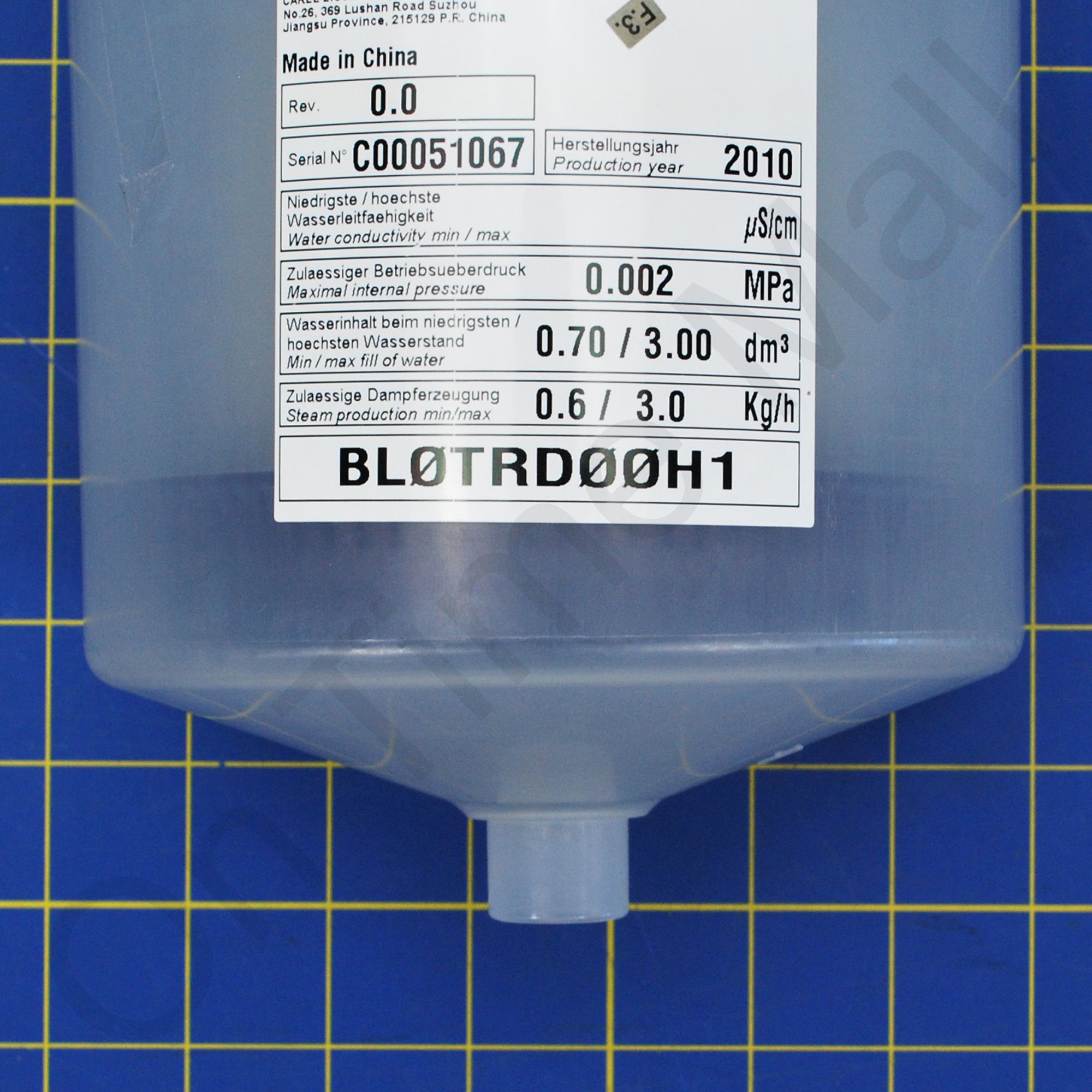 Carel replacement BL0TRD00H1 Cylinder 1-3 KG/H 3F RID. MOD. D HB. Also known as a standard cylinder or "disposable" version.